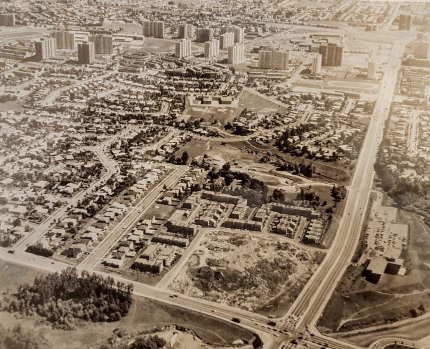 Don Mills was planned as a model town that would humanize urban life in an age of industry and the automobile. Initiated and financed by businessman E.P. Taylor and designed by Macklin Hancock, a young urban planner, it was built between 1952 and 1965 on 835 hectares of land between the west and east Don River valleys. Hancock’s planning team envisioned a self – contained community distinguished by consistent design principles and modernist style. Industry, commerce and major roads were arranged to be accessible but insulated from residential areas. Green spaces preserved natural watercourses and provided pedestrian routes between different neighbourhoods. An immediate critical and commercial success, Don Mills has been imitated in suburban development across Canada.